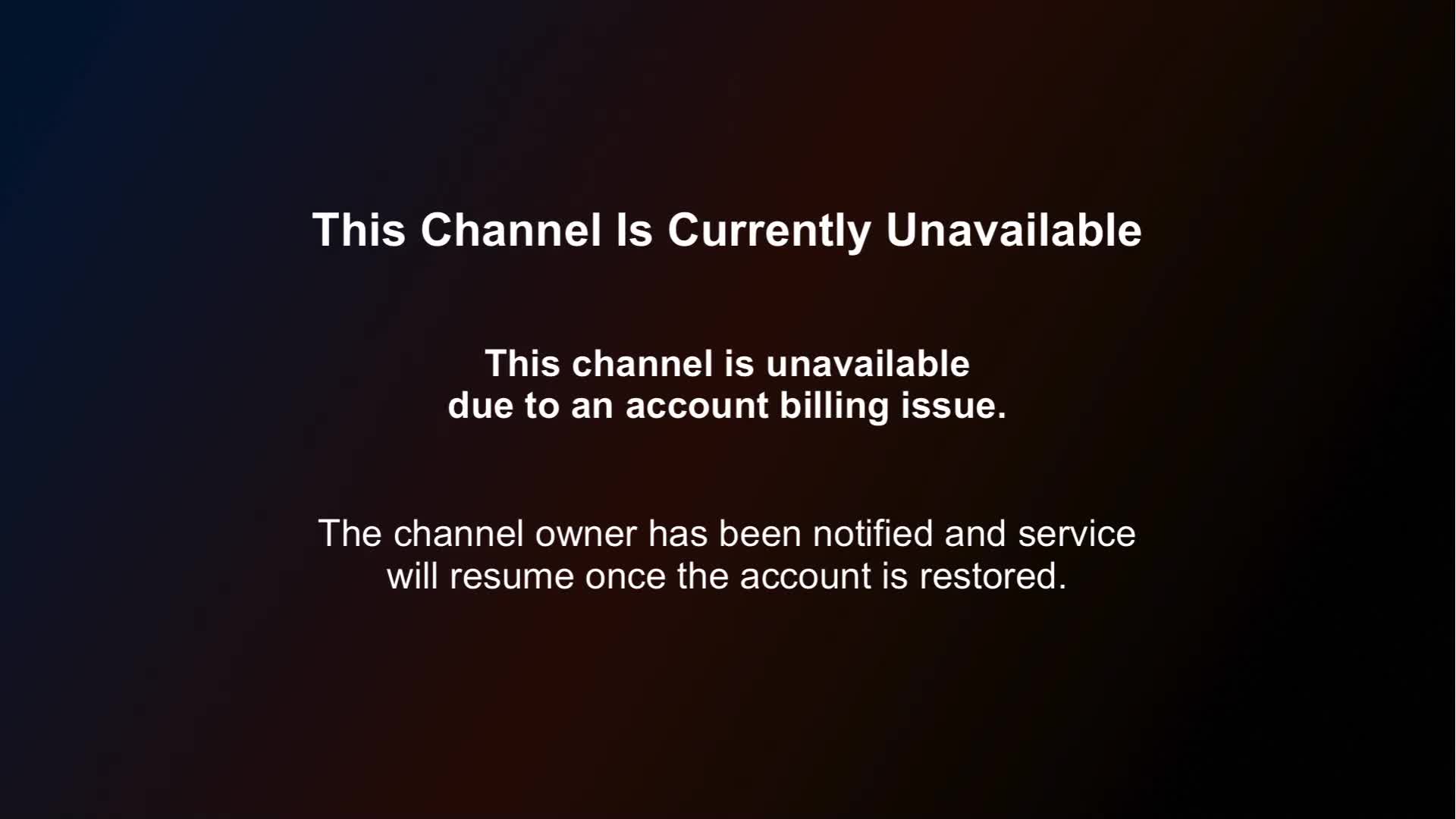 Channel Deactivated23secThis channel is unavailable due to an account billing issue. The channel owner has been notified and service will resume once the...